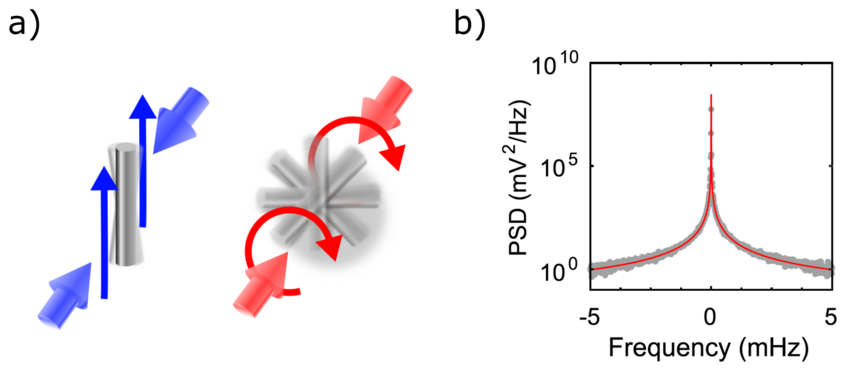 We can lock the rotation of the nanorod to an external signal, by modulating the polarization of the trapping light [3]. Amazingly, for a wide range of parameters, the locking is so good that the rotation is no longer adversely effected by environmental effects such as gas pressure or laser noise. This leads to an extremely high frequency purity; rotation rates of 1MHz have a linewidth of 1μHz at the relatively high pressures of a few milliBar.